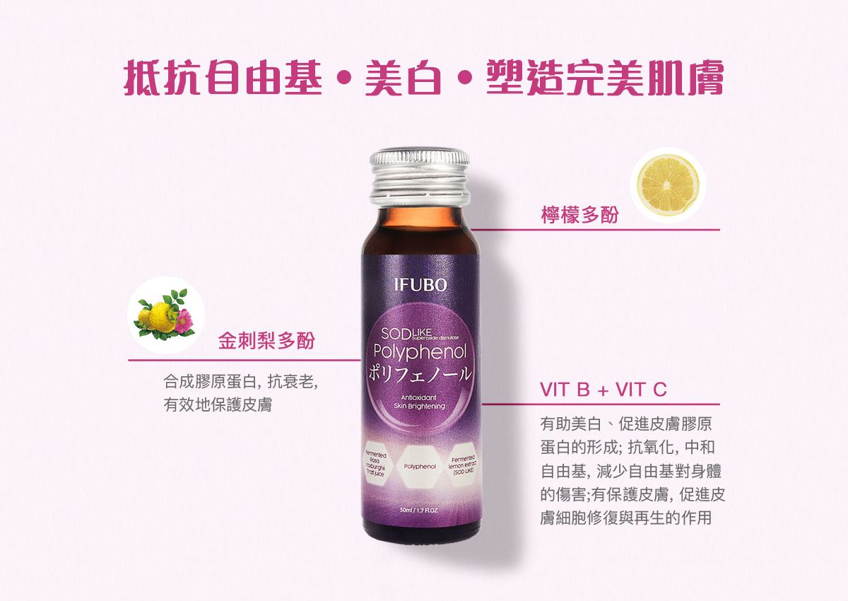 現實中很多人精挑細選各式各樣的美肌產品,都總會遇上「美肌樽頸位」,即使花盡心思亦未能達到如女星般的完美肌膚。與其把自己當成白老鼠,試盡各種護膚品作比較,不如選擇真正有效的內服美肌產品 - IFUBO SOD小分子多酚抗氧化水,讓你從內而外感受肌膚的改變。