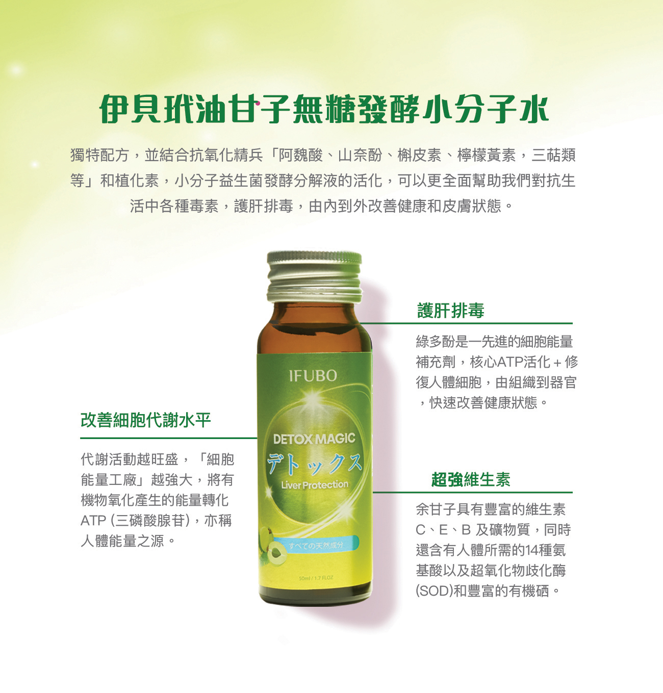 伊貝玳油甘子無糖發酵小分子水幫助護肝排毒,小分子讓營養快速全面吸收,令你由內靚到外;對於工作壓力大,長期夜瞓,喜愛喝酒或抵抗力偏差的人群特別有幫助,快速改善健康狀態,皮膚和日常狀態都可以保持更輕鬆,更巔峰。