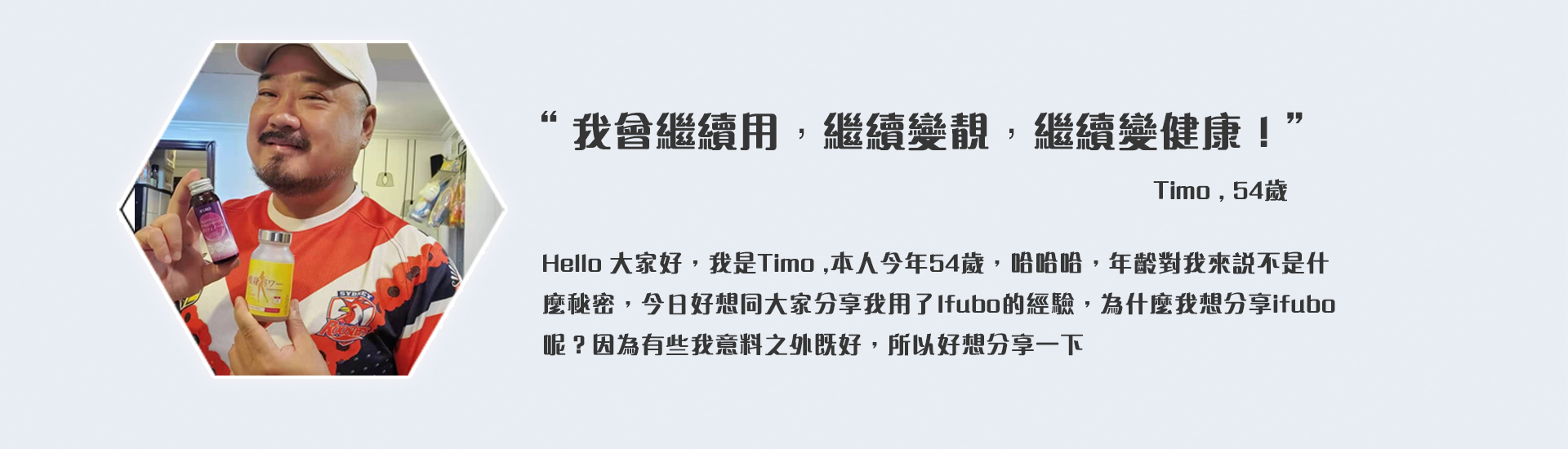Hello 大家好,我是Timo ,本人今年54歲,哈哈哈,年齡對我來說不是什麼秘密,今日好想同大家分享我用了Ifubo的經驗,為什麼我想分享ifubo呢?因為有些我意料之外既好,所以好想分享一下。