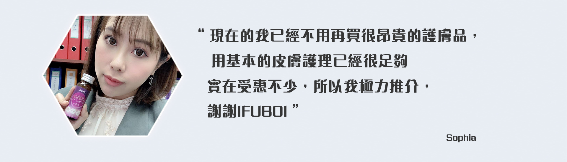 我是Sophia,任職於一間貿易公司,飲用IFUBO已經有半年的時間,現在分享一下我的成果,愛美的我一直在使用護膚品方面都很講究,因為保持美貌與健康是女人的天職,以前總是很崇尚高級品牌護膚品,抱著愈貴愈好的心態,結果事與願違,使用後令皮膚變得更差,花了很多錢和時間看醫生。